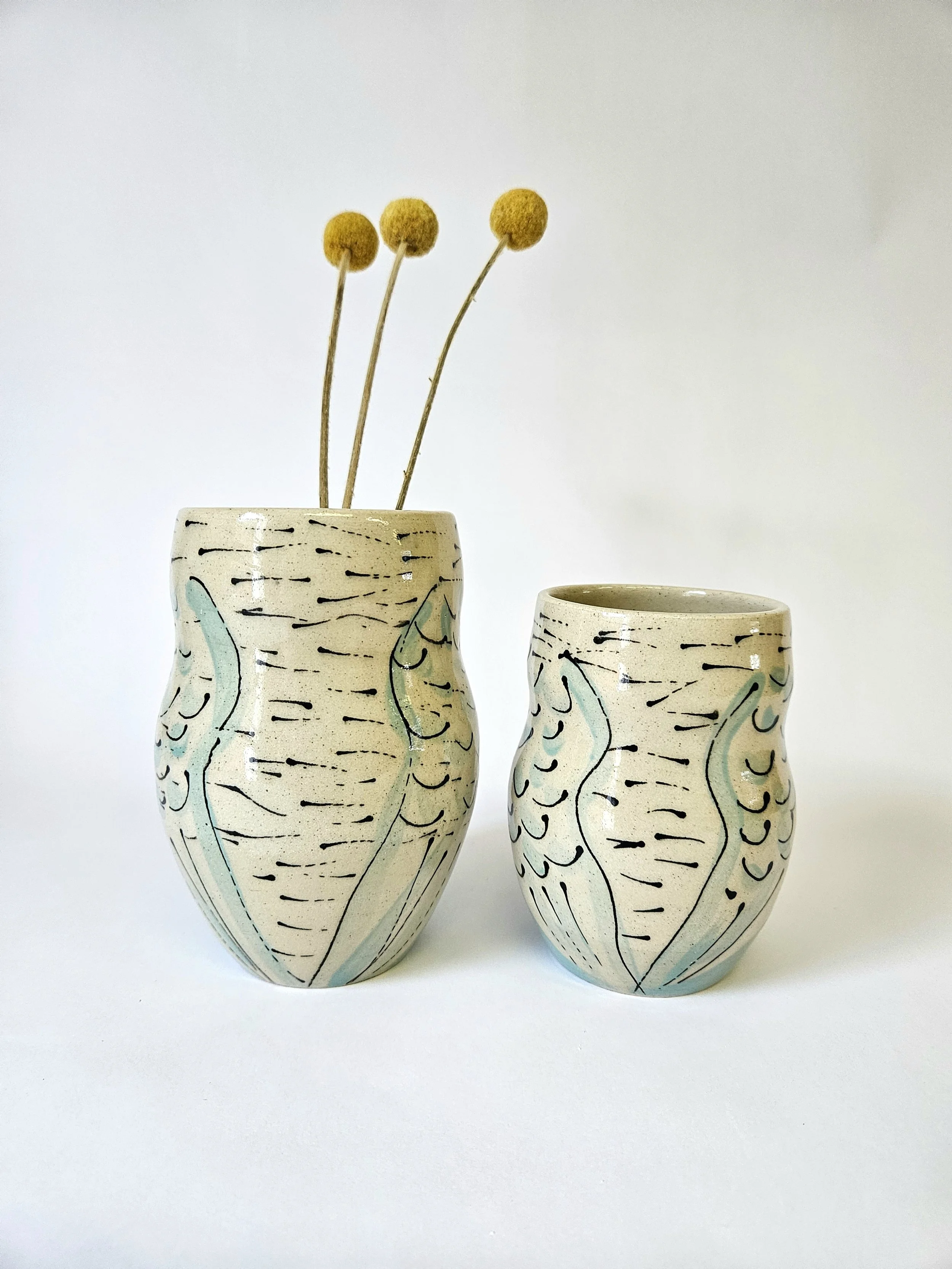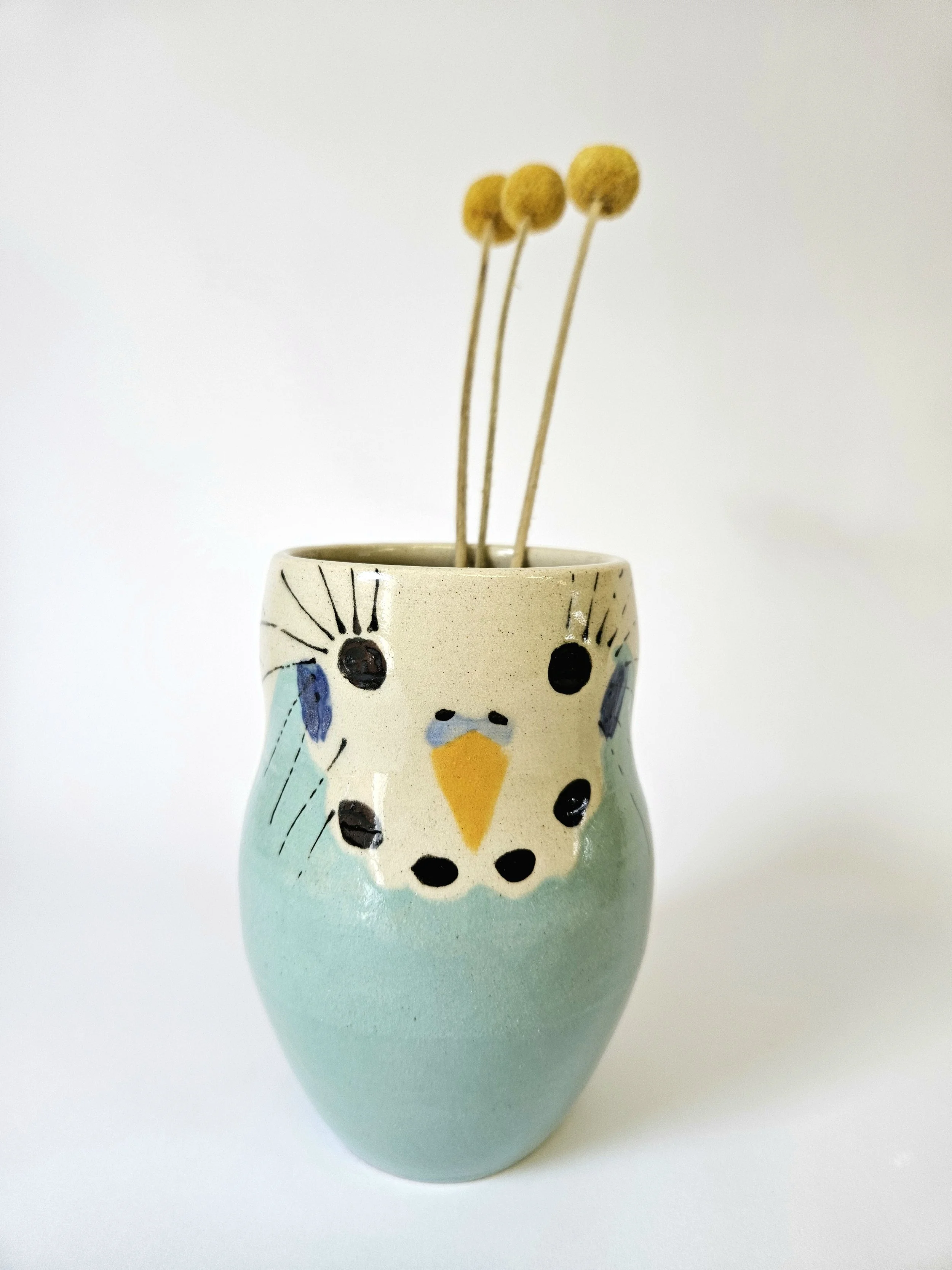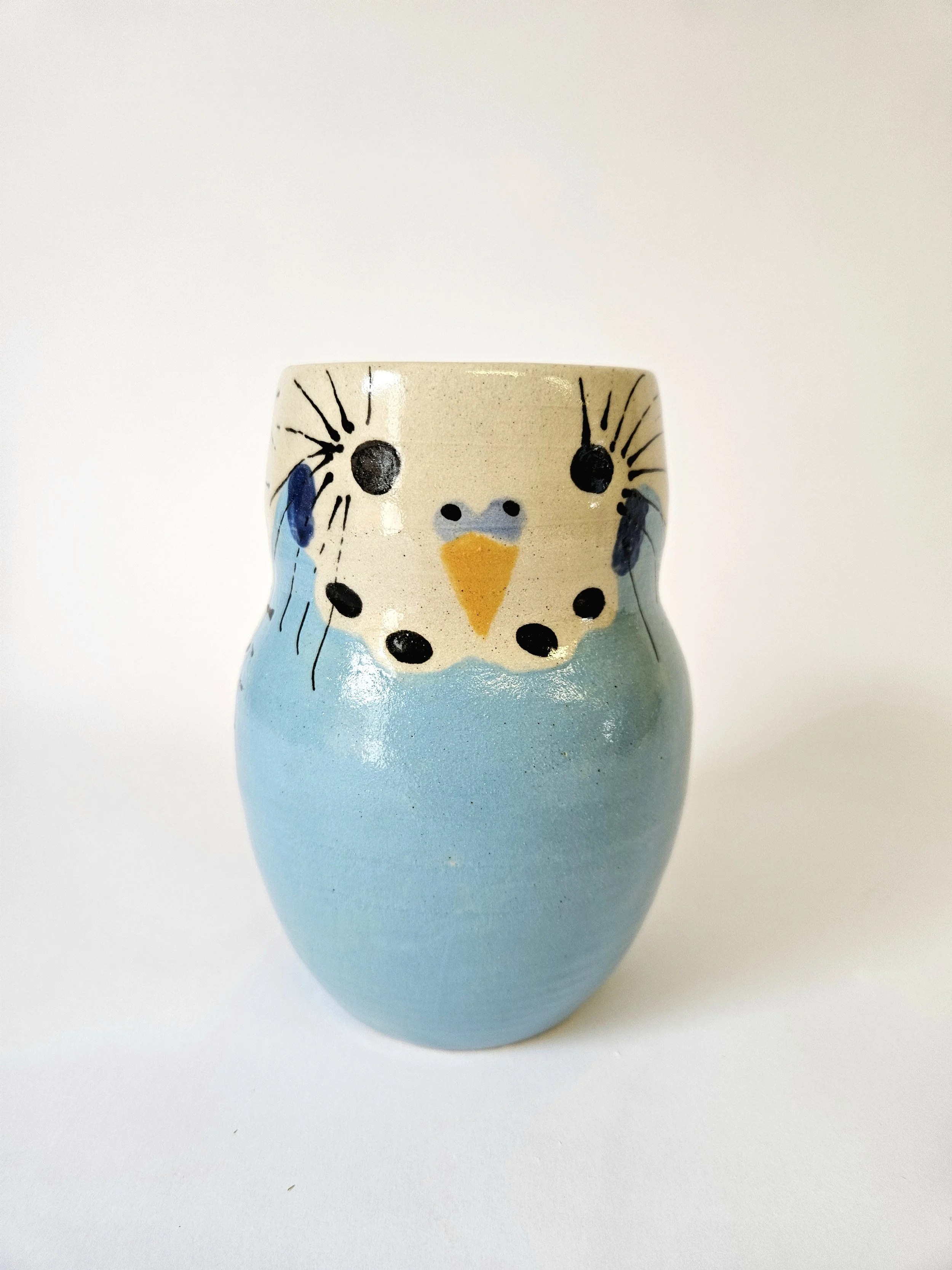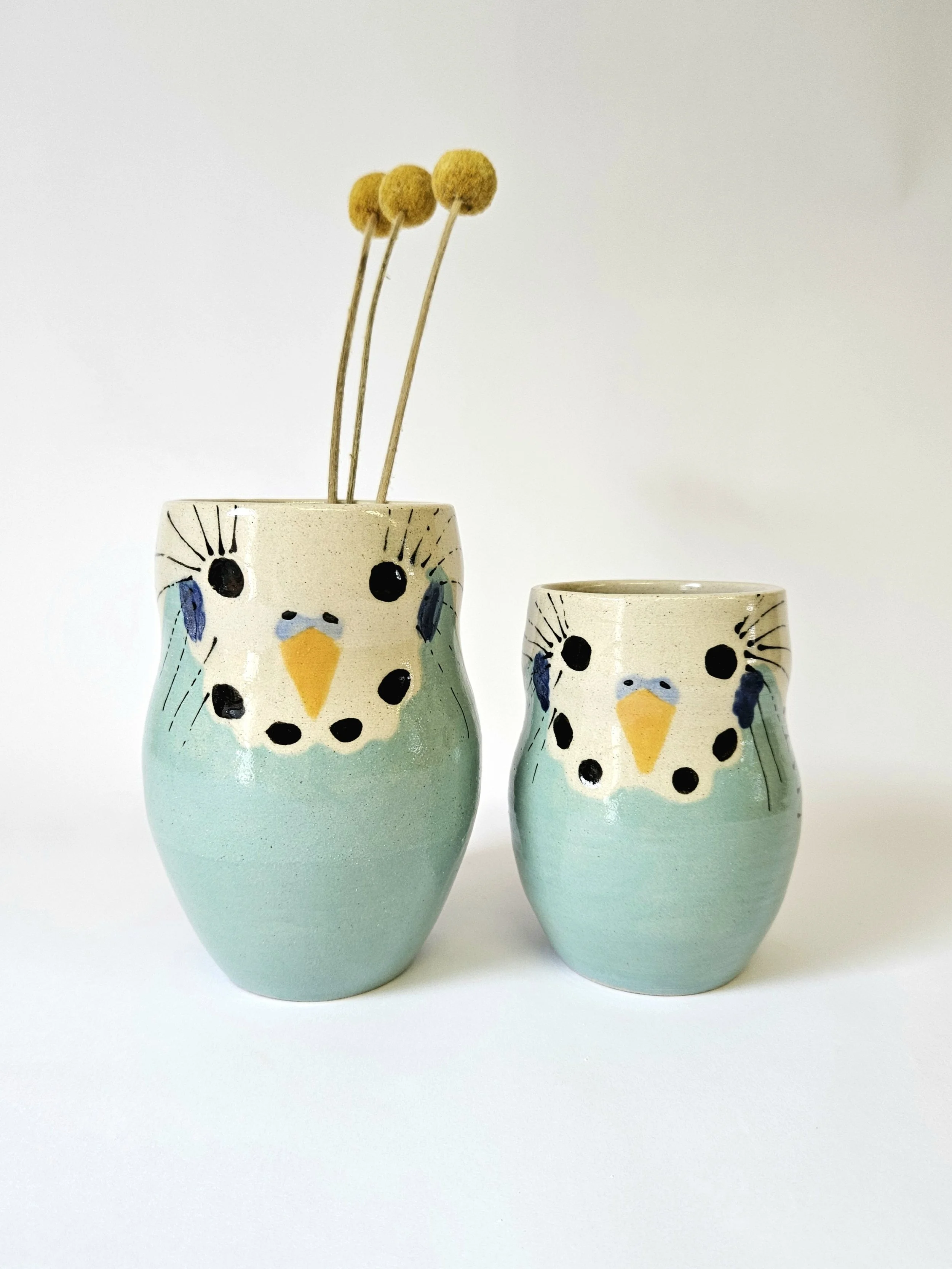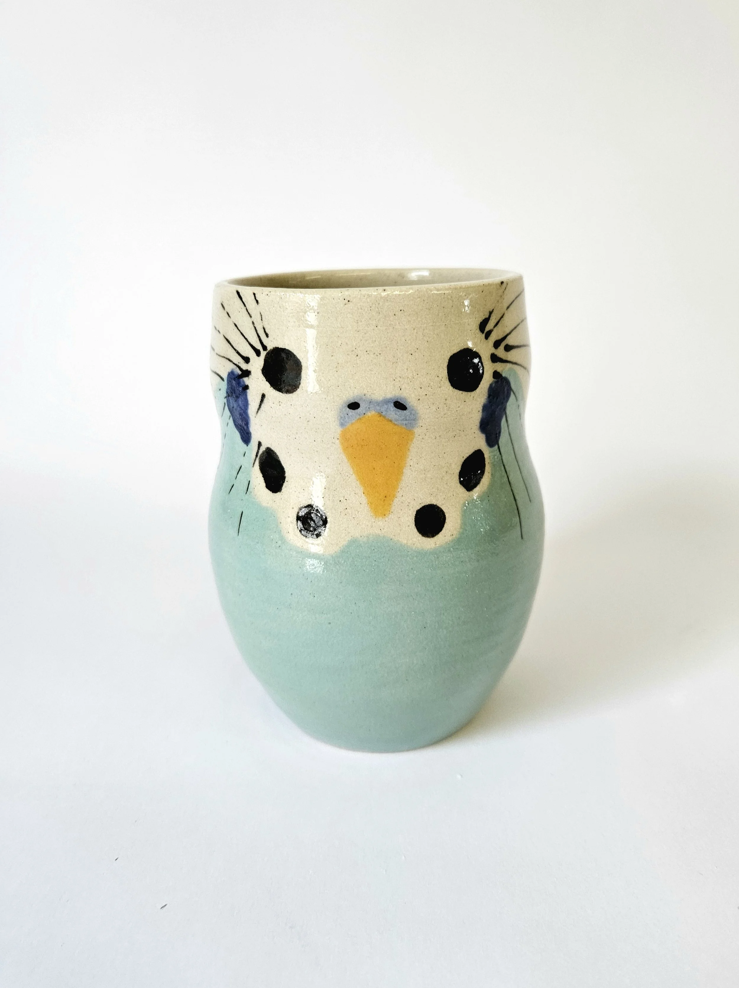 This budgie mug has been wheel-thrown using stoneware clay by Charlotte Miller in her Bournemouth-based studio. This mug has been hand painted with underglaze, glazed and high fired, making it waterproof and hygienic.