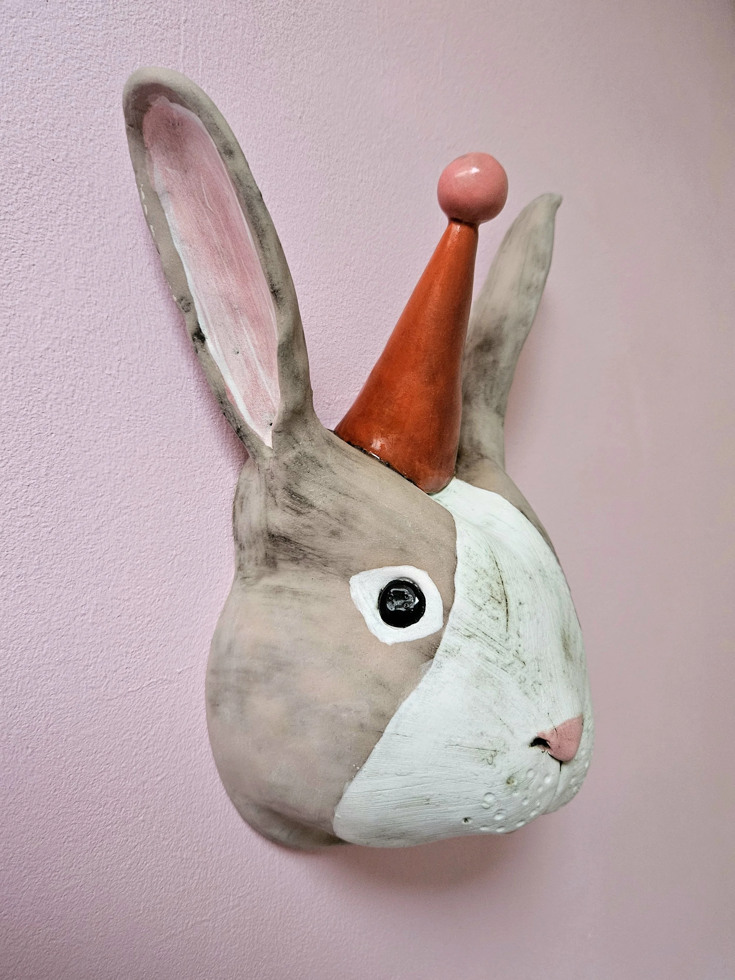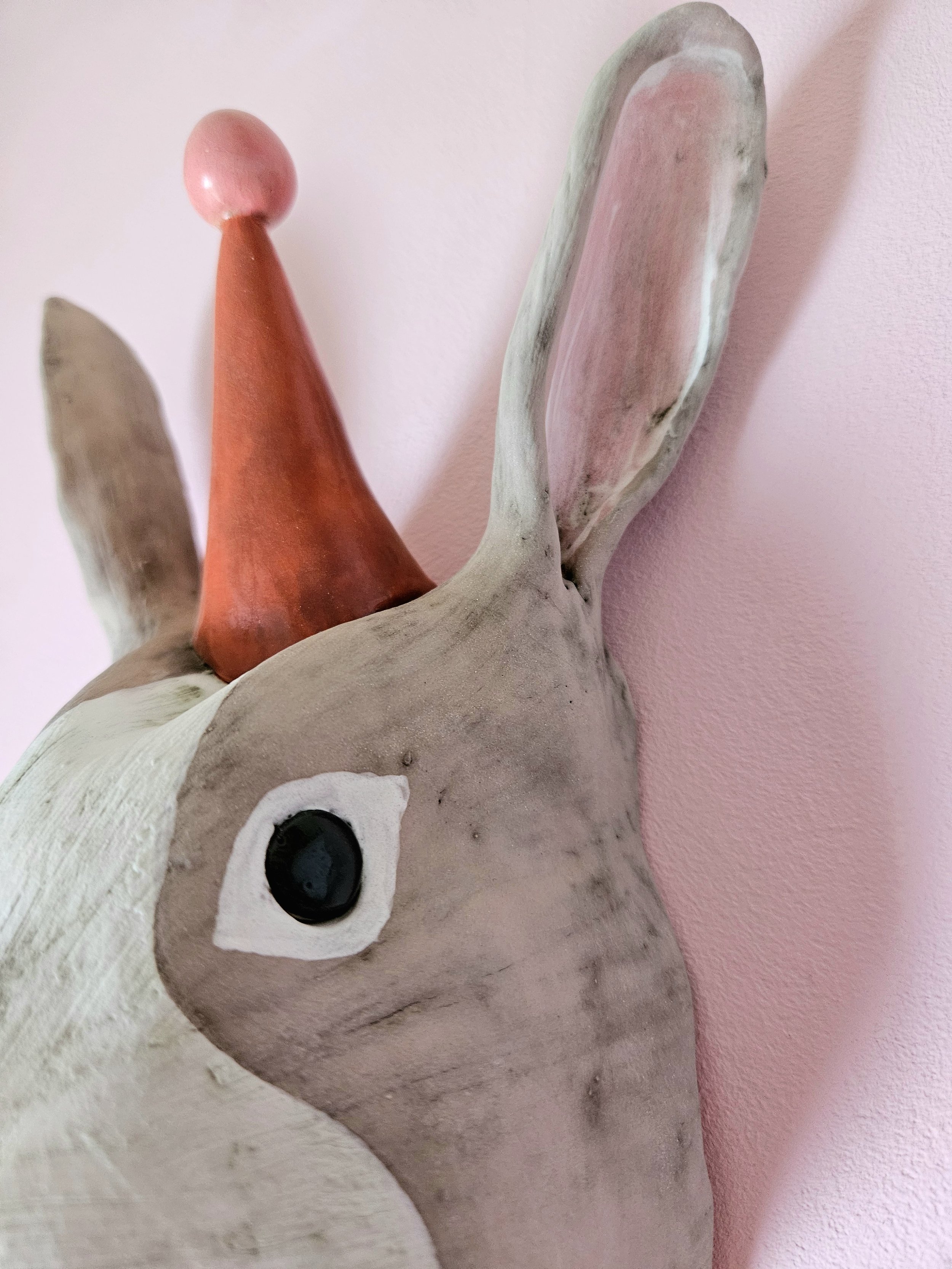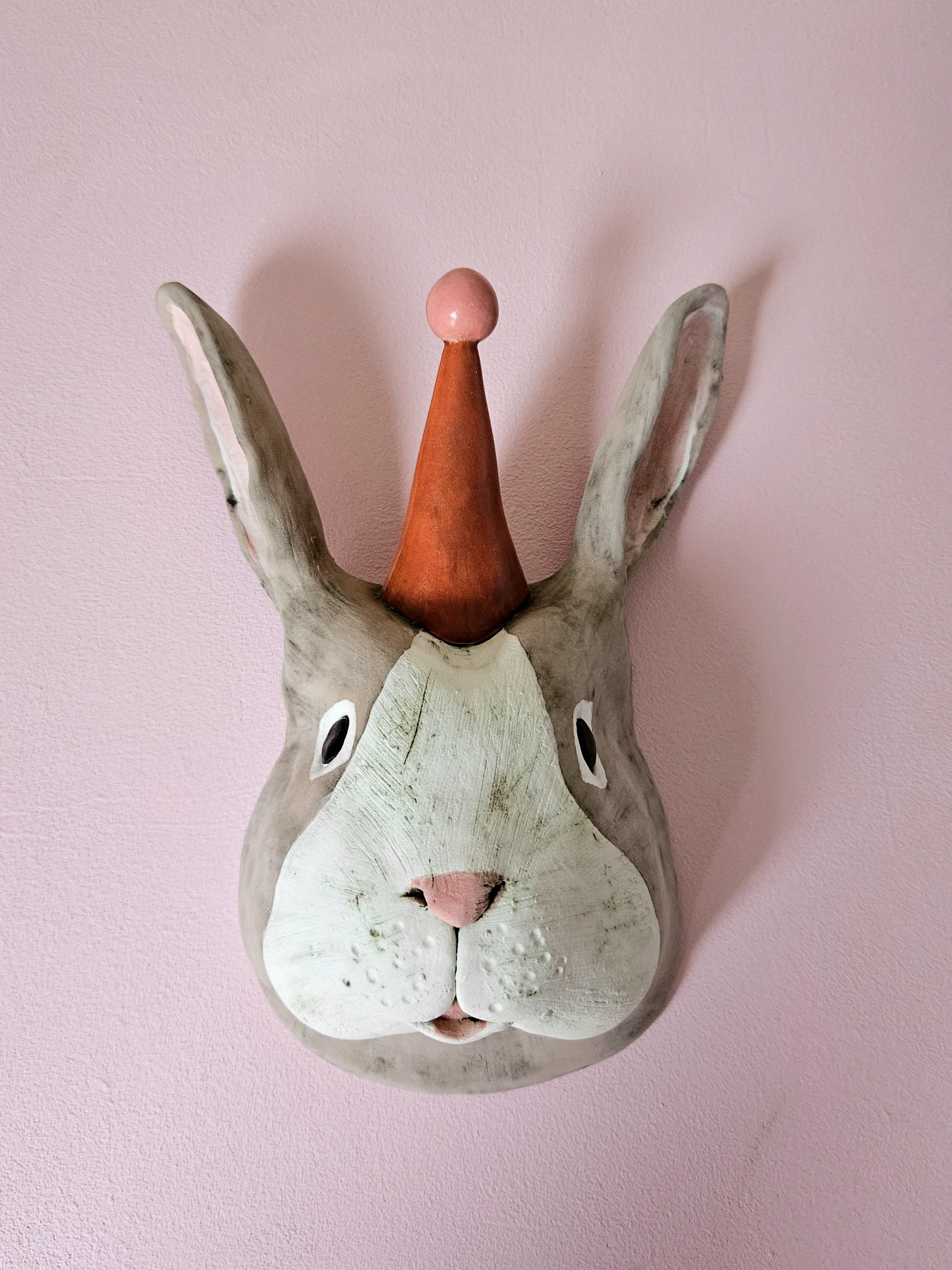 Say hello to Lenny the rabbit. A wall mounted trophy style animal head in a party hat.