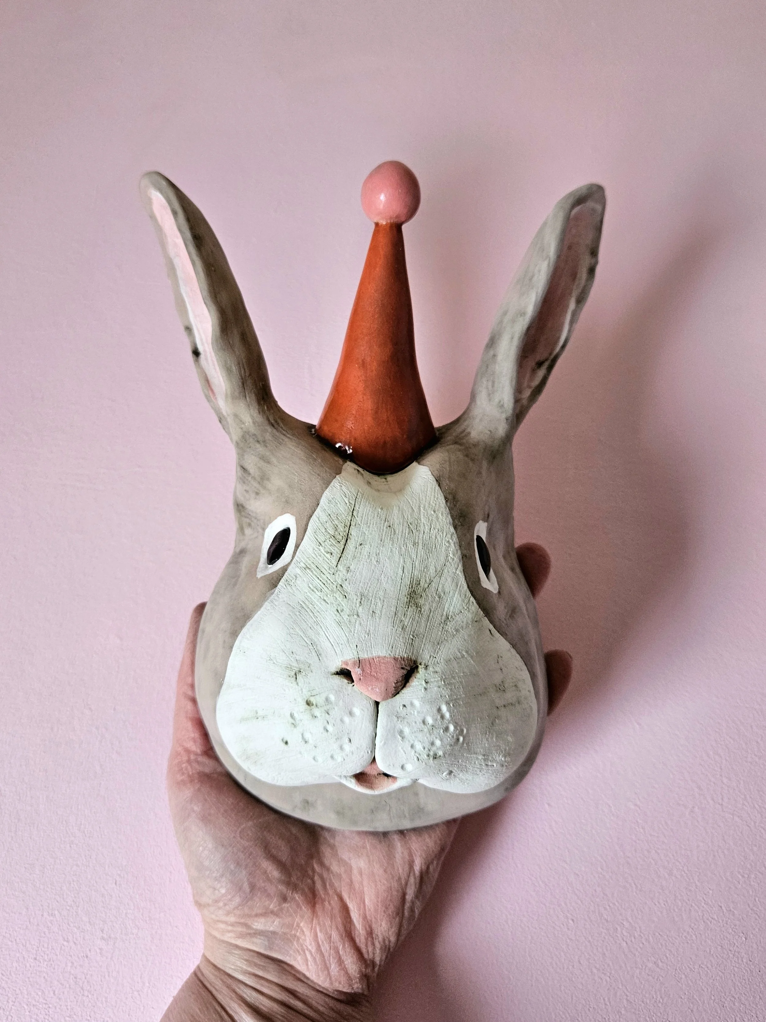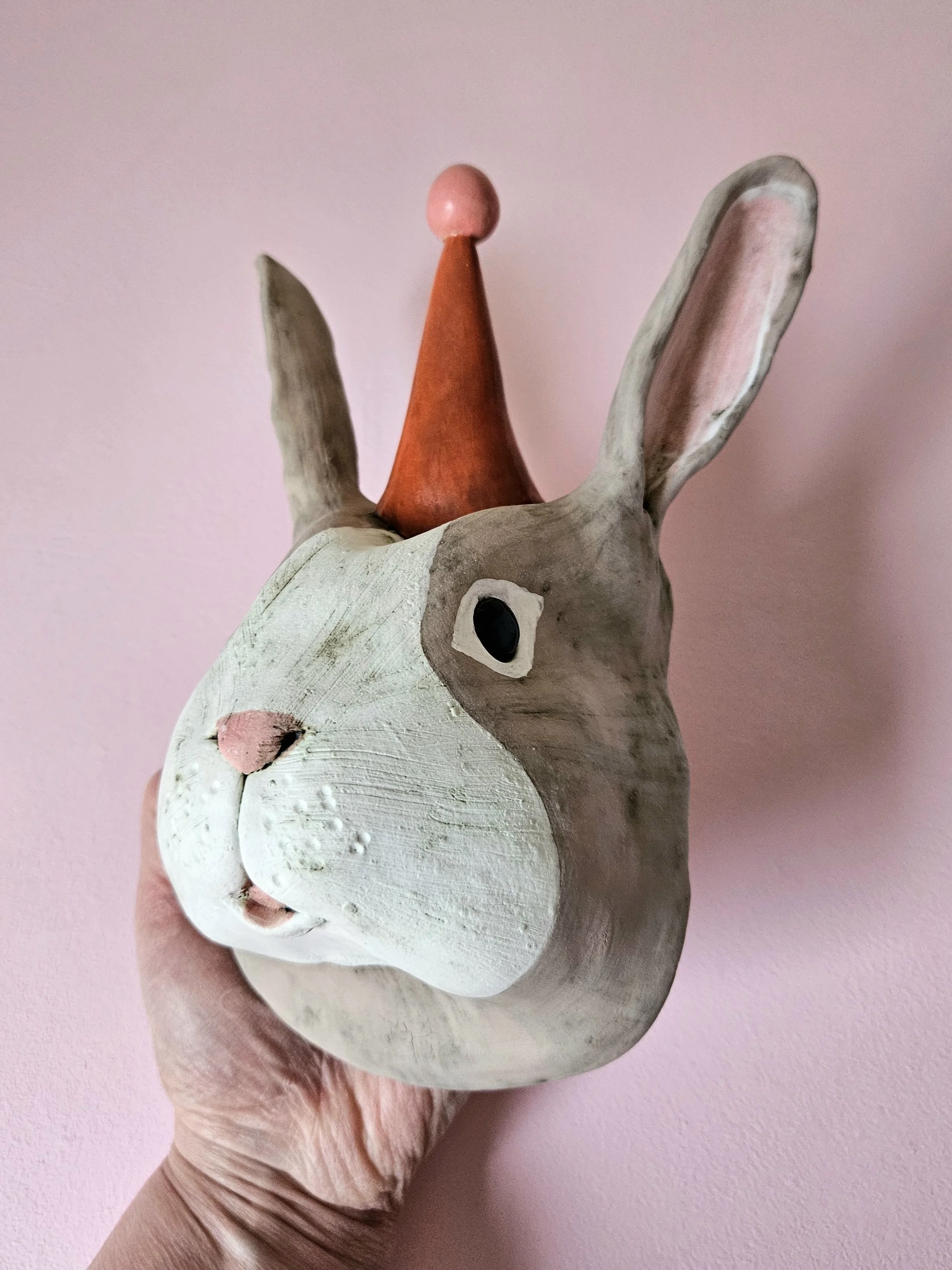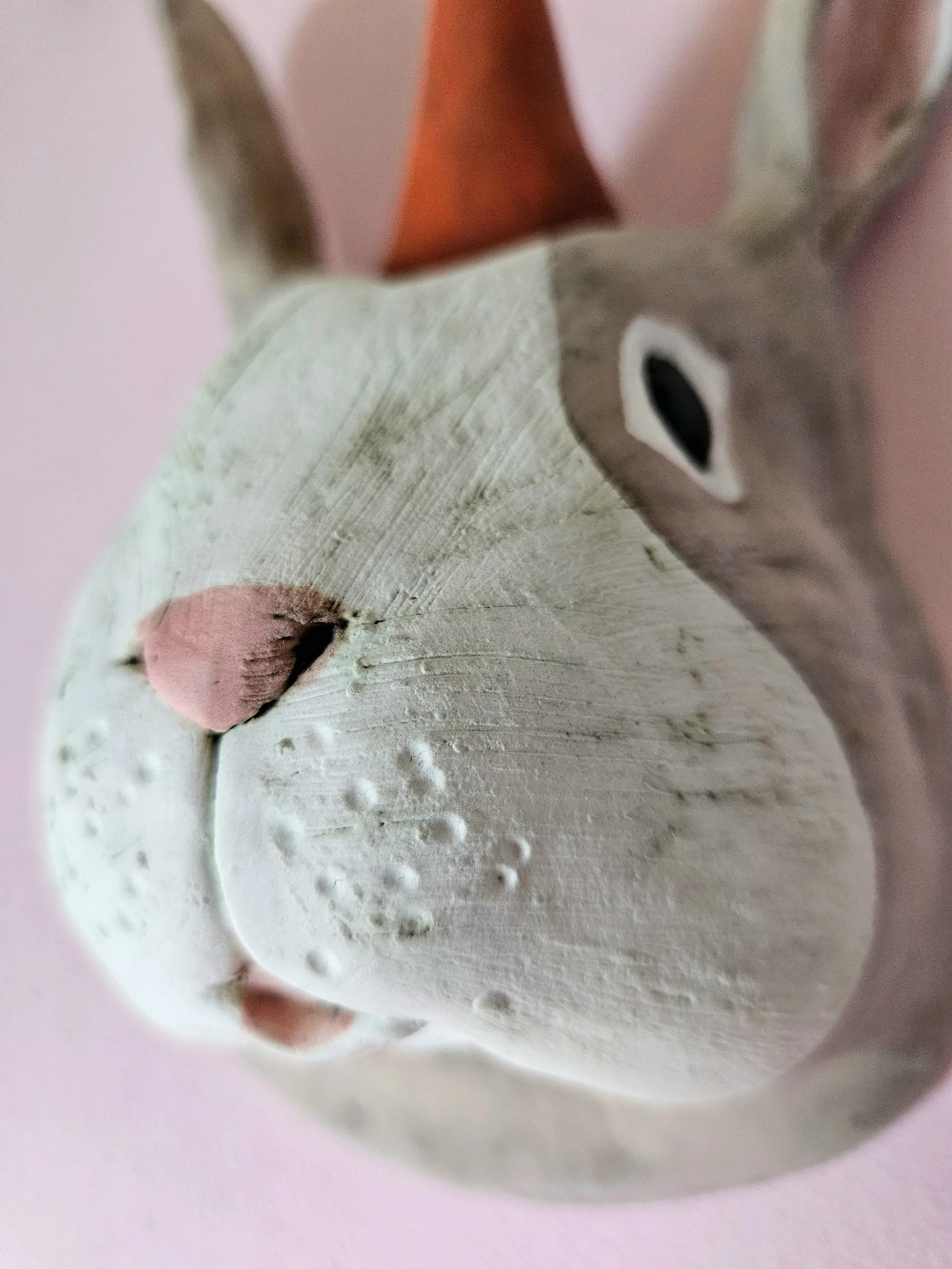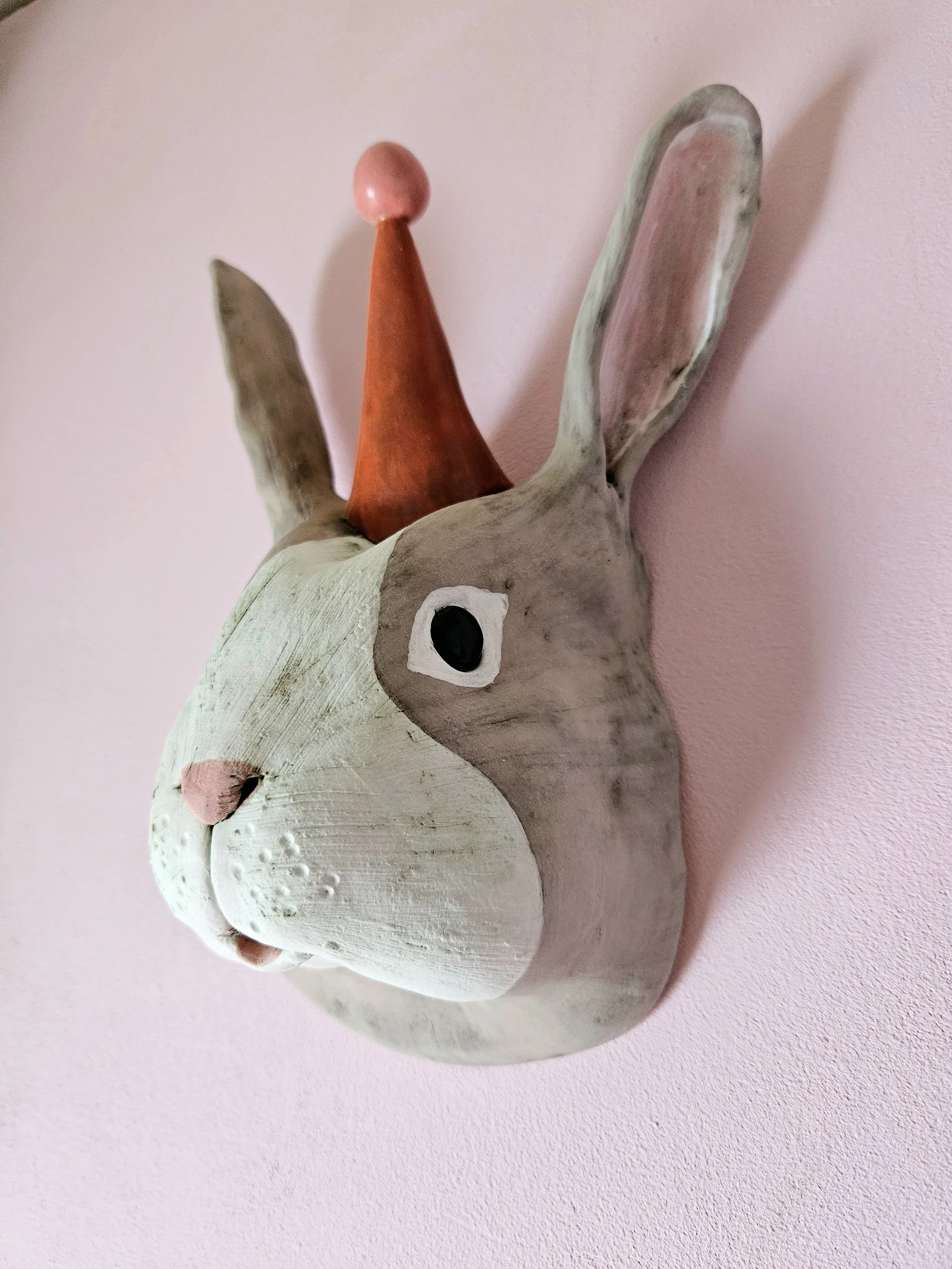 Say hello to Lenny the rabbit. A wall mounted trophy style animal head in a party hat.