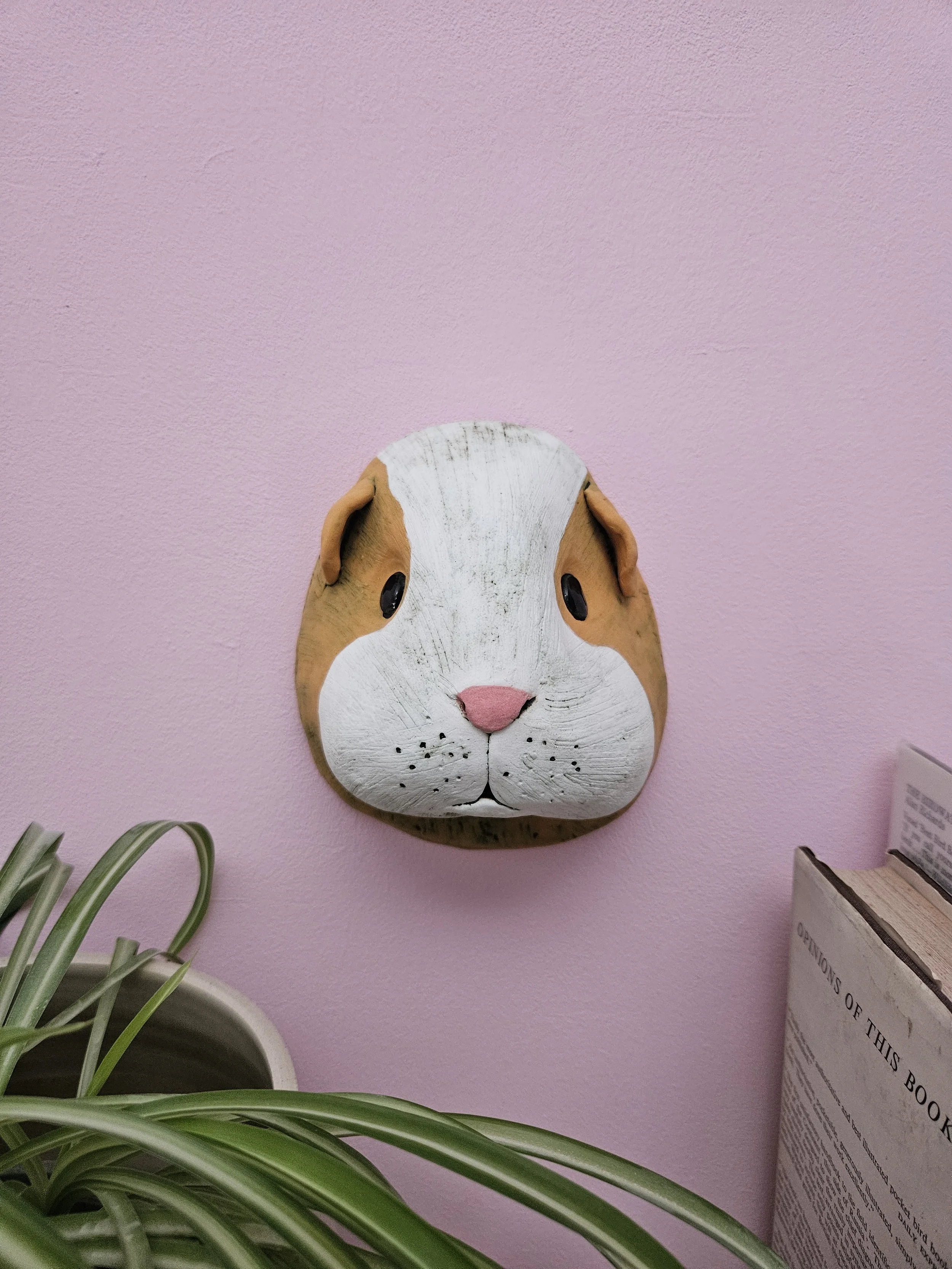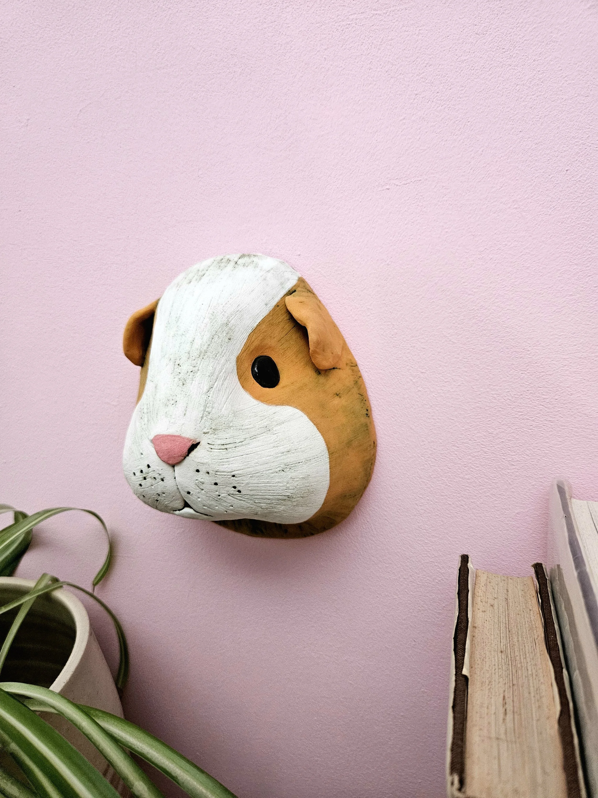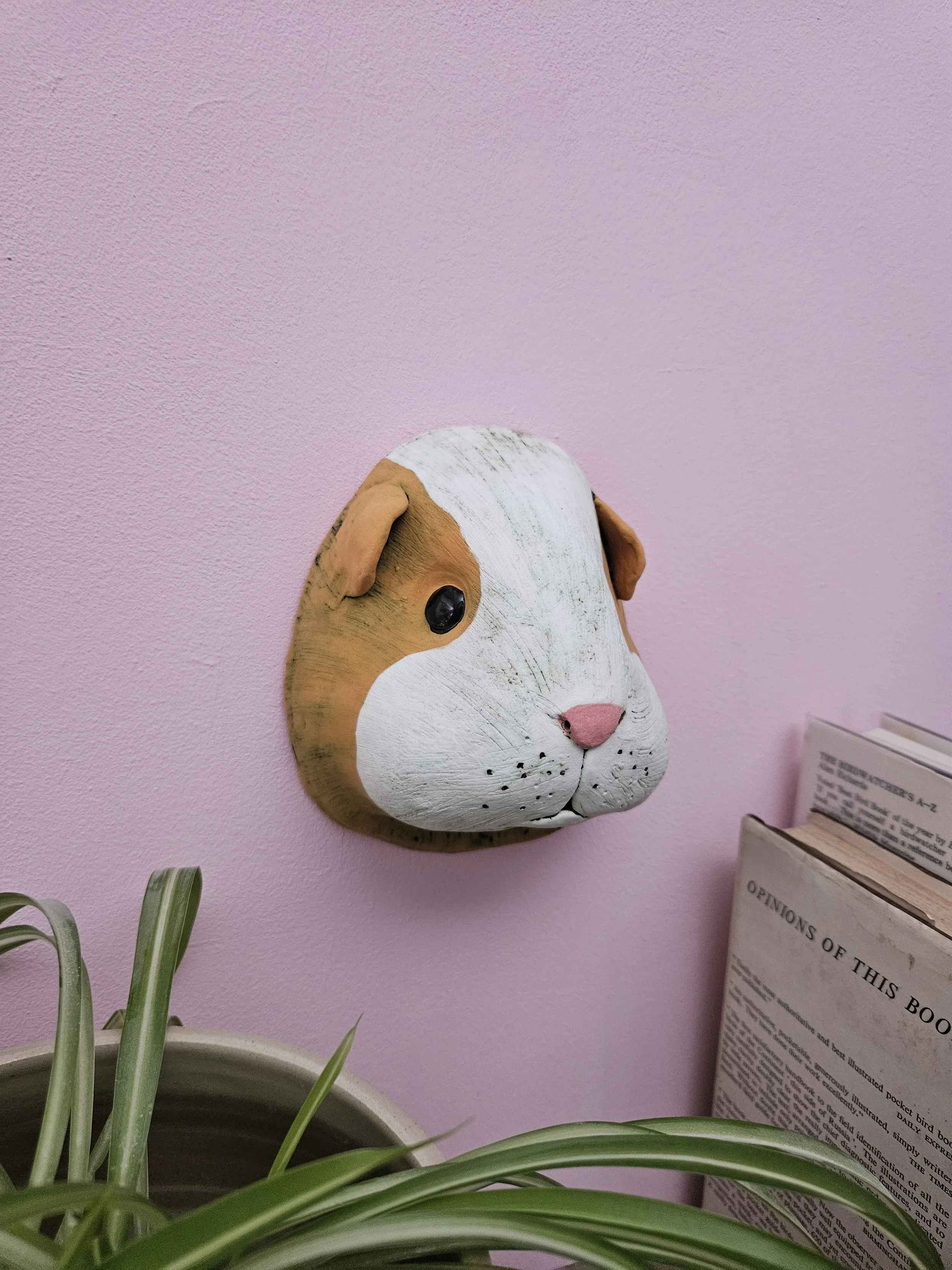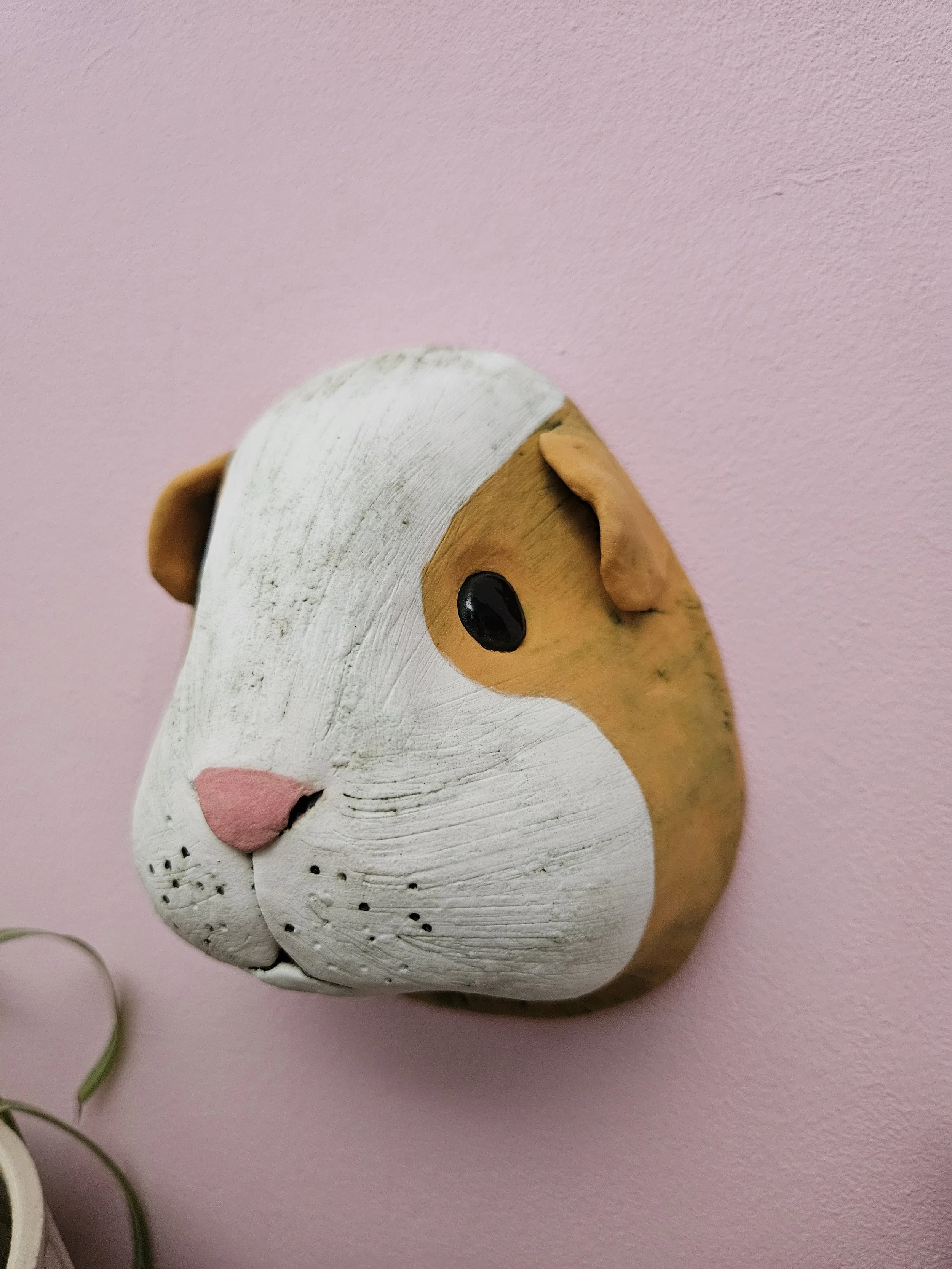 Say hello to George guinea pig. A wall mounted trophy style animal head in a woolly hat.